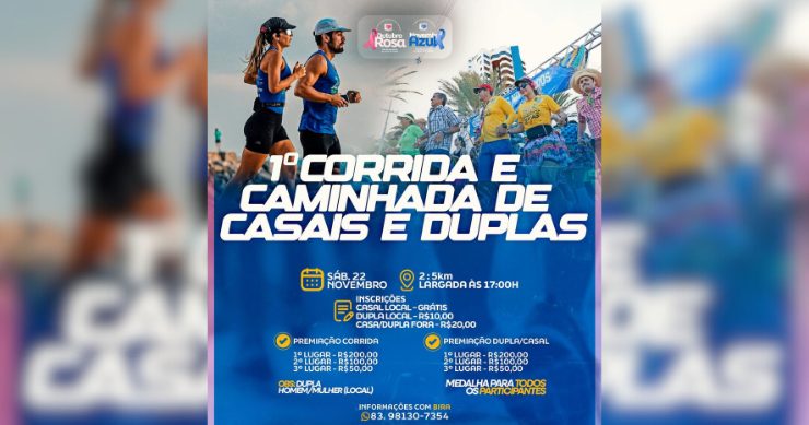 A Prefeitura de Pedra Lavrada, por meio das Secretarias de Esporte, Saúde e Assistência Social (SEMAS), realiza no dia 22 de novembro, às 17h, a 1ª Corrida e Caminhada de Casais e Duplas, unindo as campanhas Outubro Rosa e Novembro Azul em uma grande celebração pela vida, amor e bem-estar.