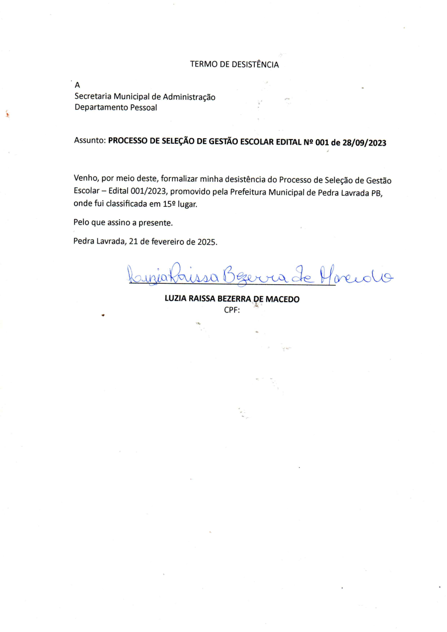 TERMO DE DESISTÊNCIA – PROCESSO DE SELEÇÃO DE GESTÃO ESCOLAR – EDITAL N° 0001/2025