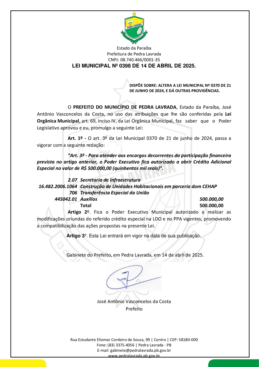 LEI N° 0398/2025 – DISPÕE SOBRE ALTERA A LEI MUNICIPAL Nº 0370 DE 21 DE JUNHO DE 2024