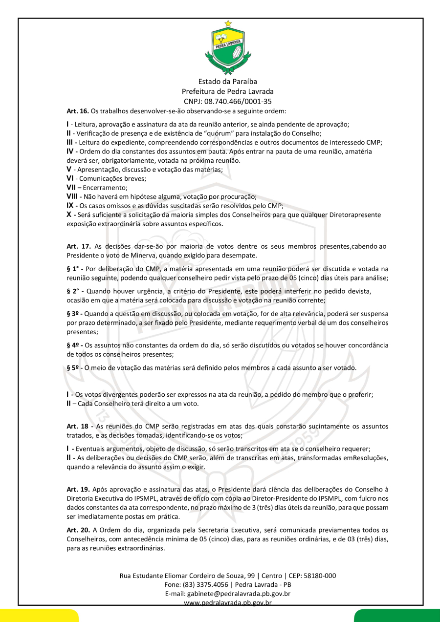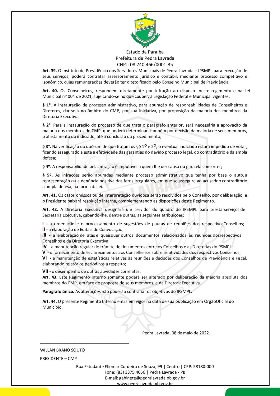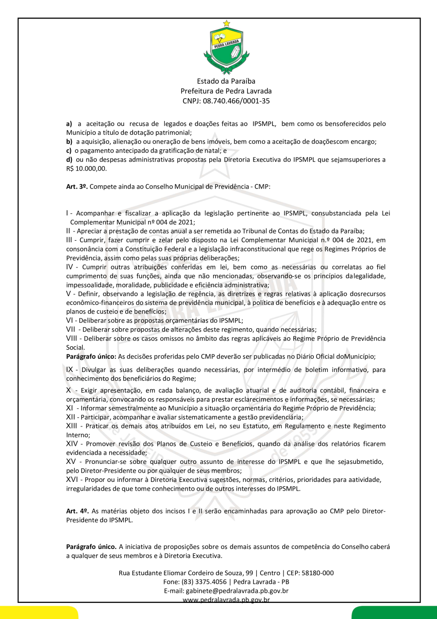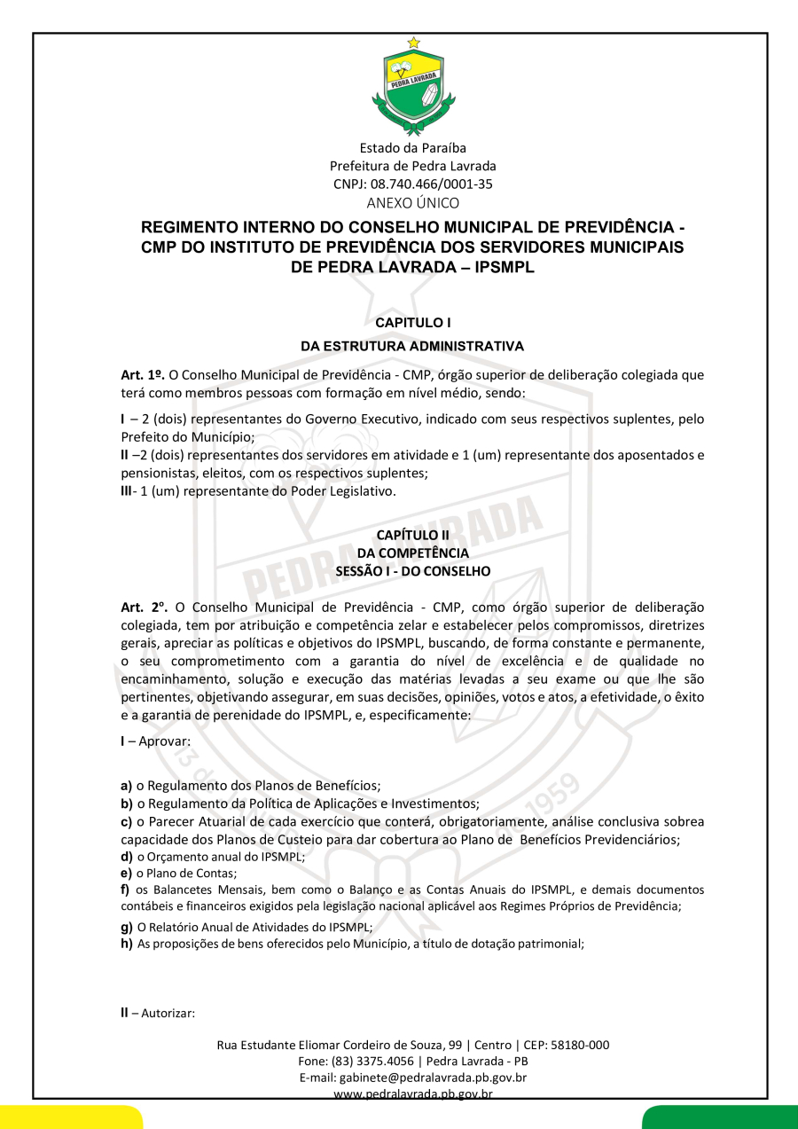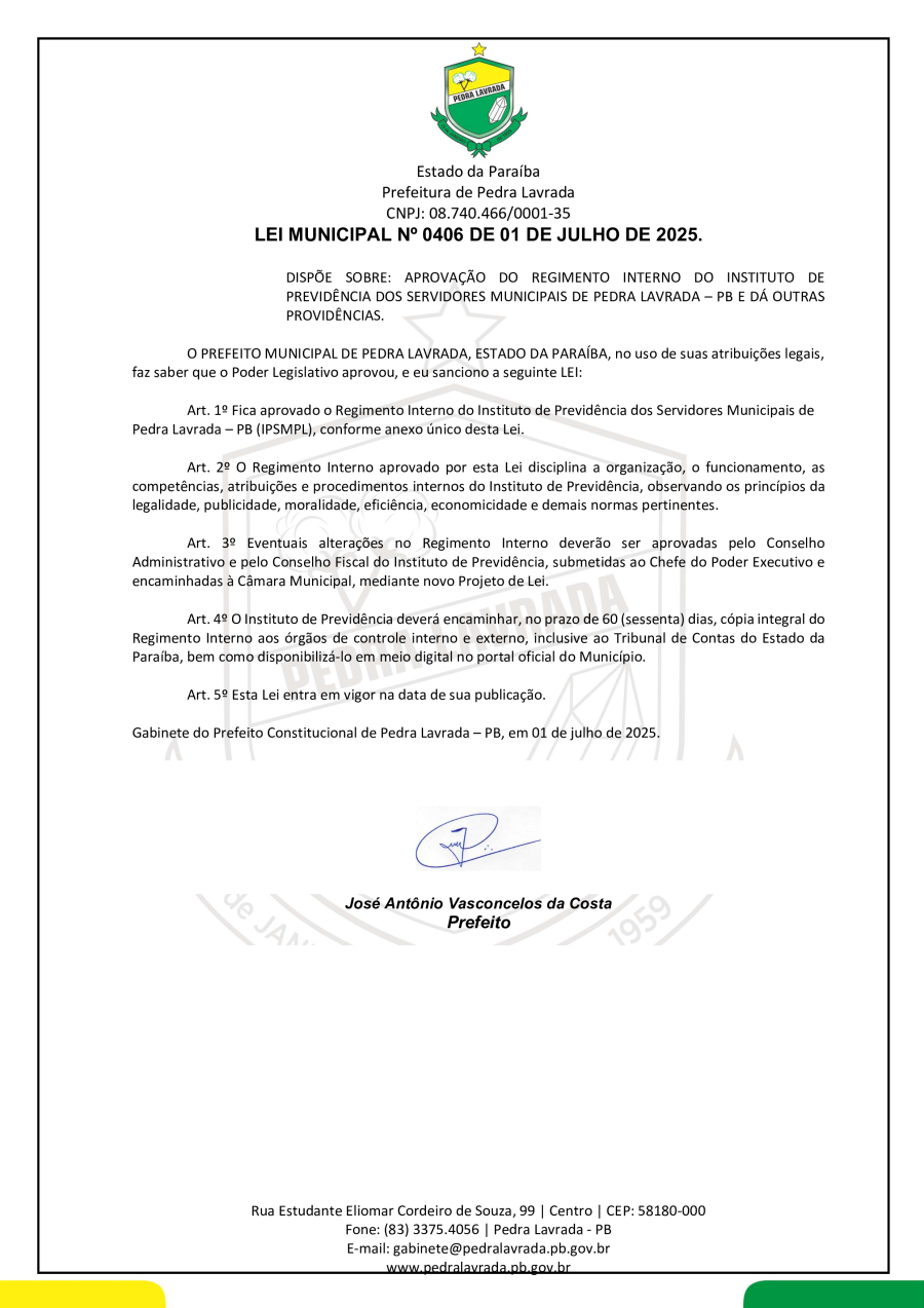 LEI N° 0406/2025 – DISPÕE SOBRE APROVAÇÃO DO REGIMENTO INTERNO DO INSTITUTO DE PREVIDÊNCIA DOS SERVIDORES MUNICIPAIS DE PEDRA LAVRADA
