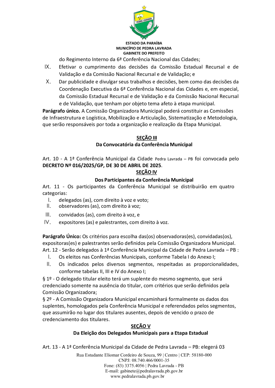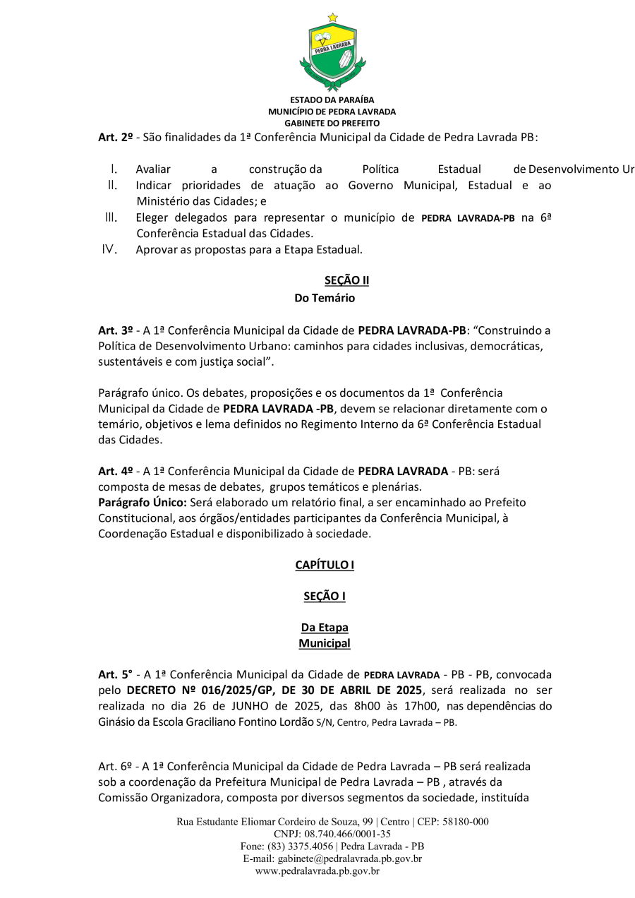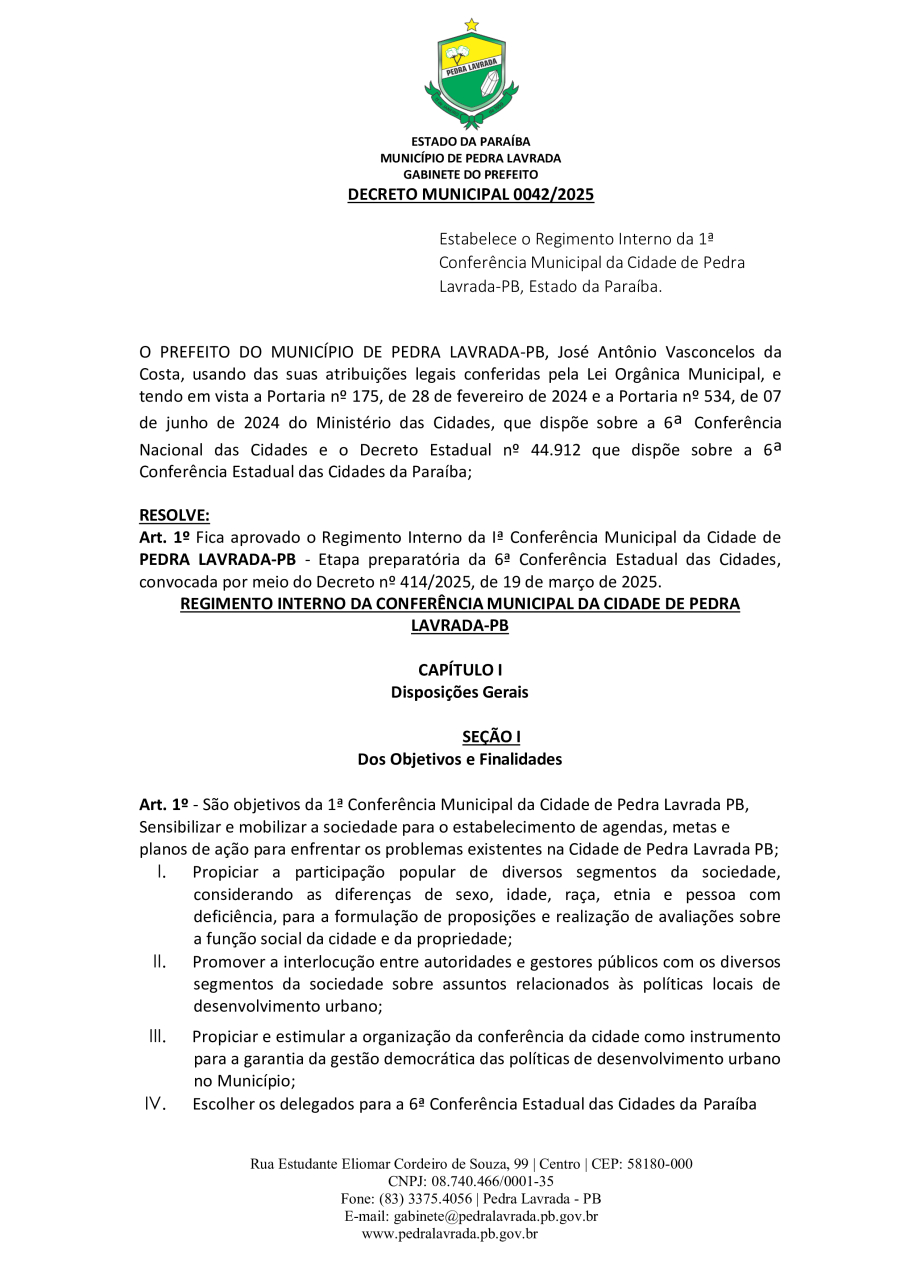 DECRETO N° 0042/2025 – ESTABELECE O REGIMENTO INTERNO DA 1ª CONFERÊNCIA MUNICIPAL DA CIDADE DE PEDRA LAVRADA-PB ESTADO DA PARAÍBA