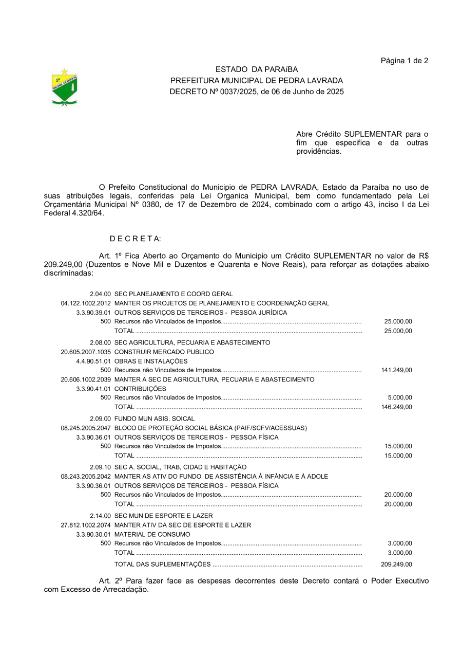 DECRETO N° 0037/2025 – ABRE CRÉDITO SUPLEMENTAR PARA O FIM QUE ESPECIFICA