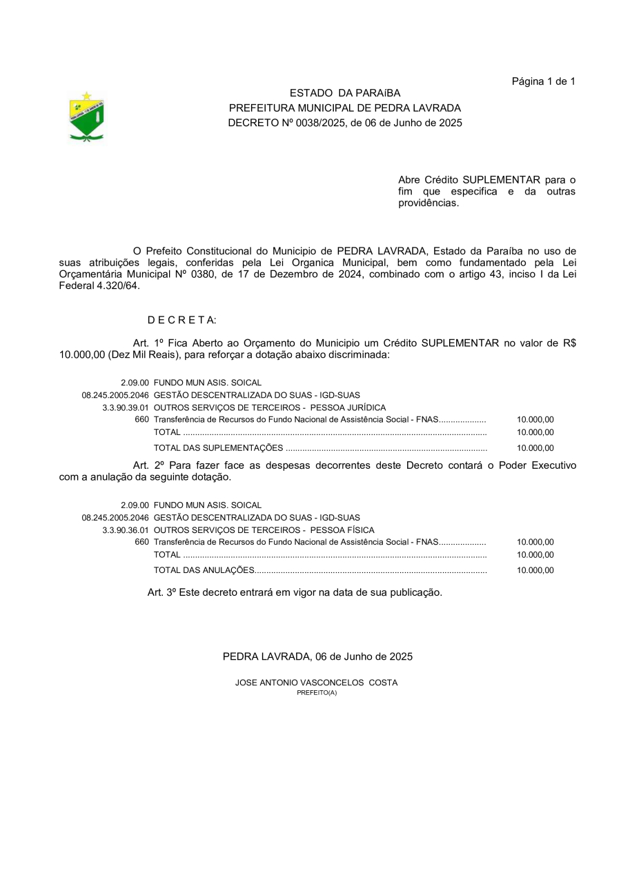• DECRETO N° 0038/2025 – ABRE CRÉDITO SUPLEMENTAR PARA O FIM QUE ESPECIFICA