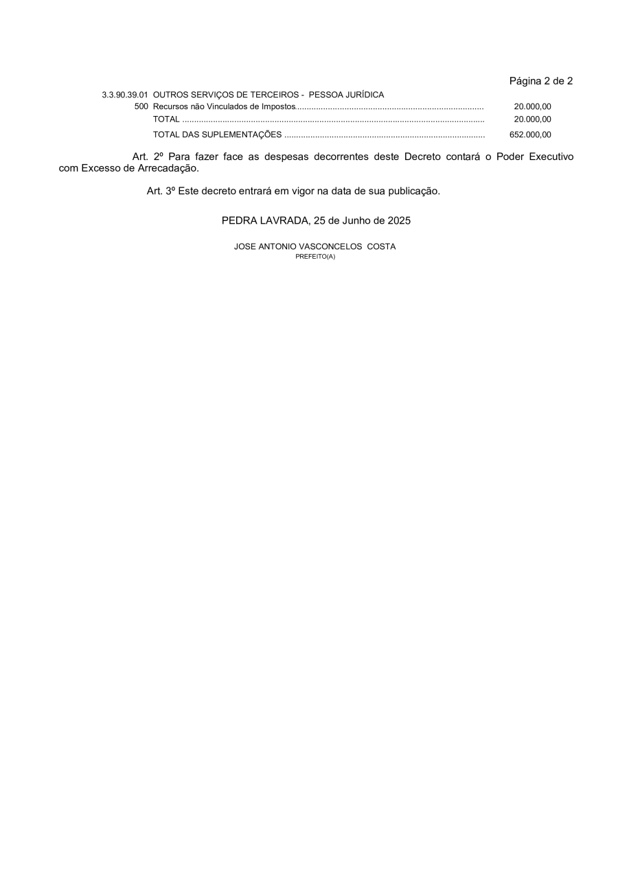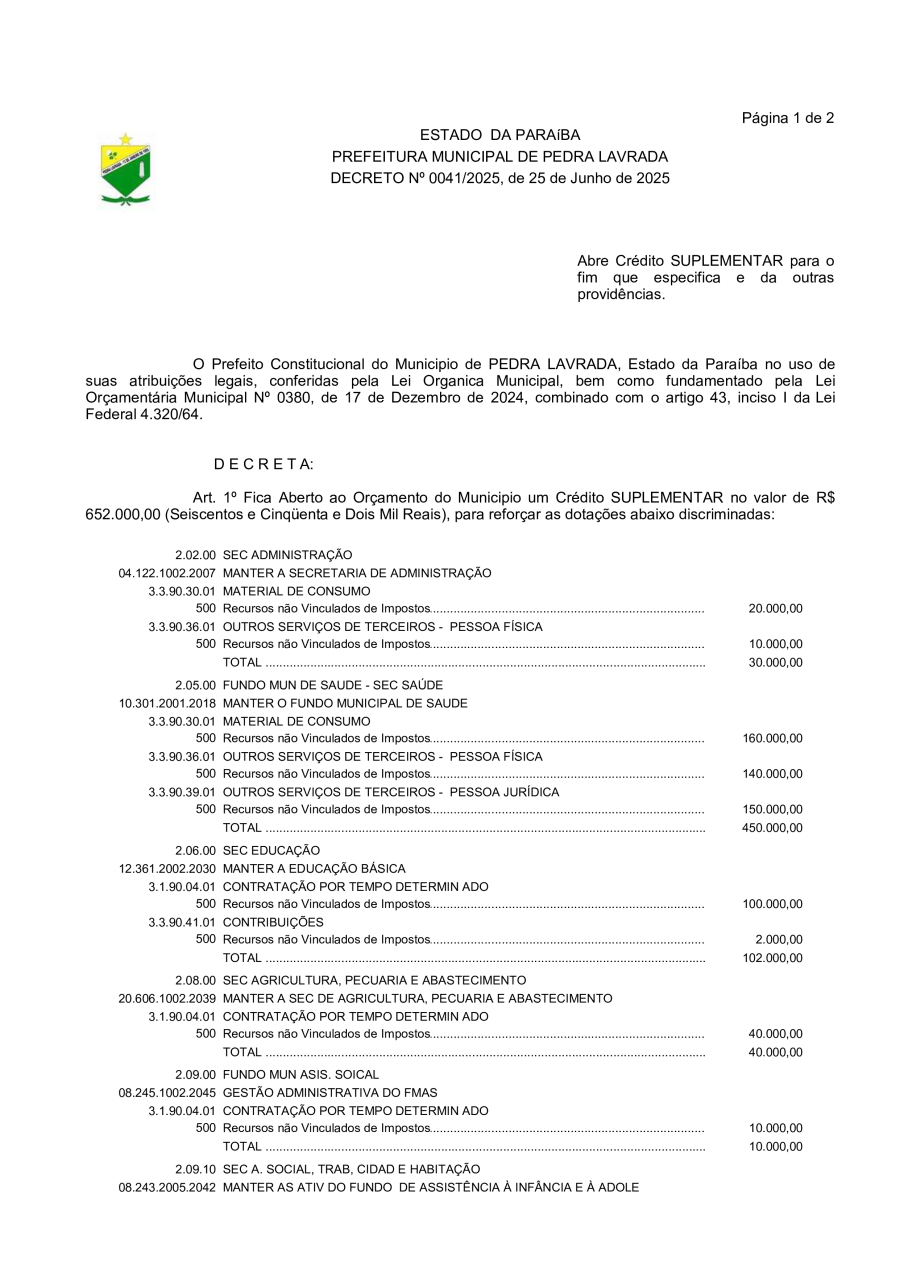 DECRETO N° 0041/2025 – ABRE CRÉDITO SUPLEMENTAR PARA O FIM QUE ESPECIFICA