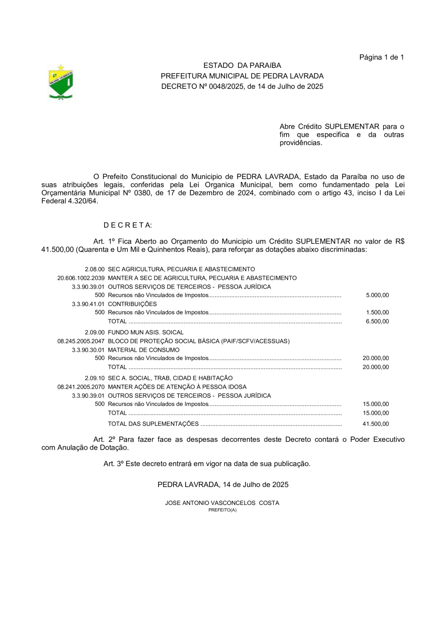 DECRETO N° 0048/2025 – ABRE CRÉDITO SUPLEMENTAR PARA O FIM QUE ESPECIFICA