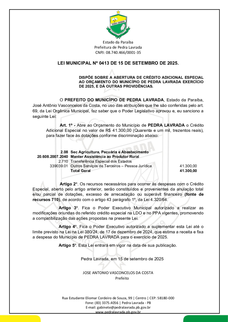 LEI N° 0413/2025 – DISPÕE SOBRE A ABERTURA DE CRÉDITO ADICIONAL ESPECIAL AO ORÇAMENTO DO MUNICÍPIO