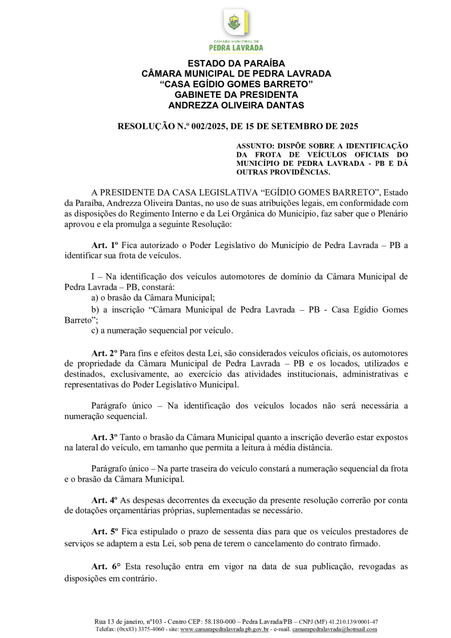 RESOLUÇÃO N° 0002/2025 – DISPÕE SOBRE A IDENTIFICAÇÃO DA FROTA DE VEÍCULOS OFICIAIS DO MUNICÍPIO