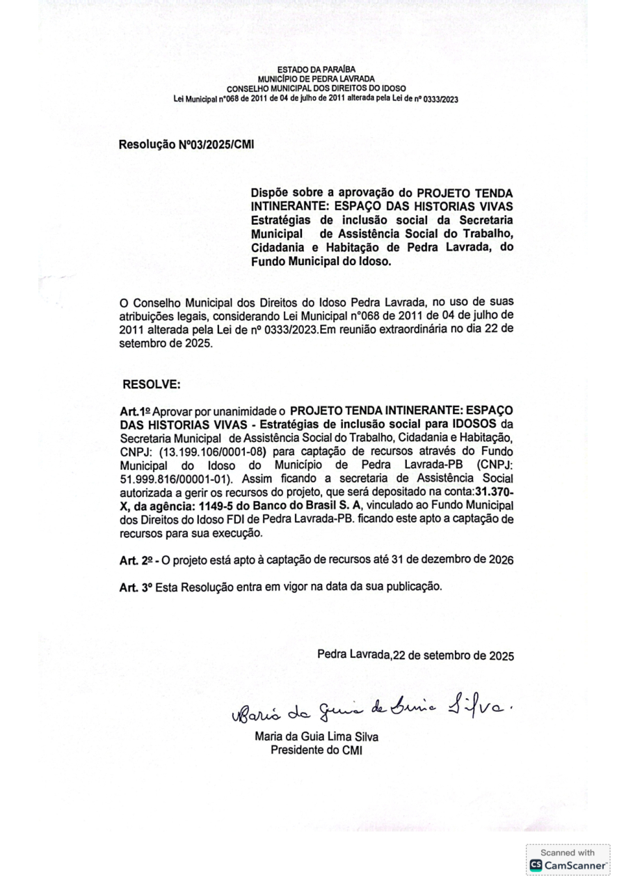 RESOLUÇÃO N° 0003/2025 – DISPÕE SOBRE A APROVAÇÃO DE PROJETO