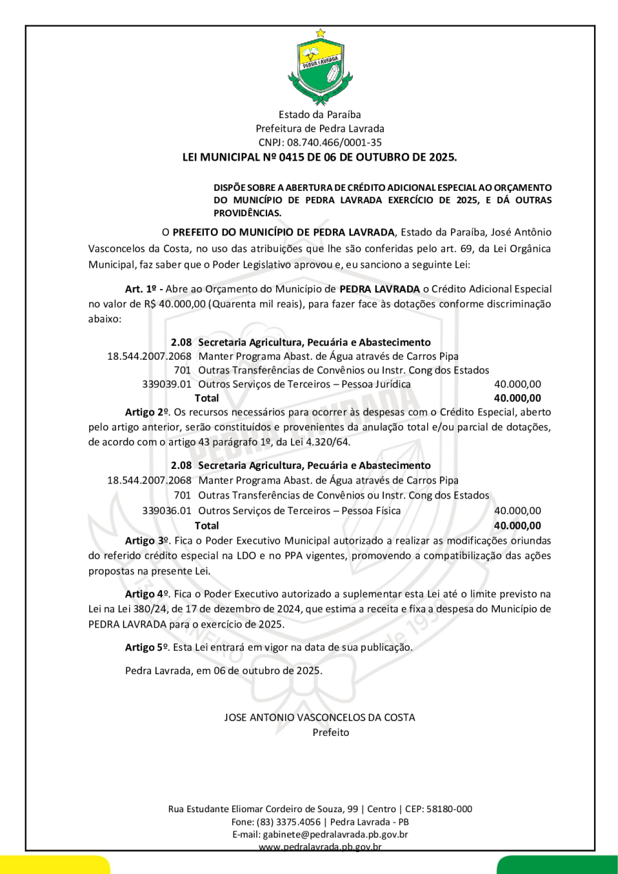 LEI MUNICIPAL N° 0415/2025 – DISPÕE SOBRE A ABERTURA DE CRÉDITO ADICIONAL ESPECIAL AO ORÇAMENTO DO MUNICÍPIO DE PEDRA LAVRADA EXERCÍCIO DE 2025