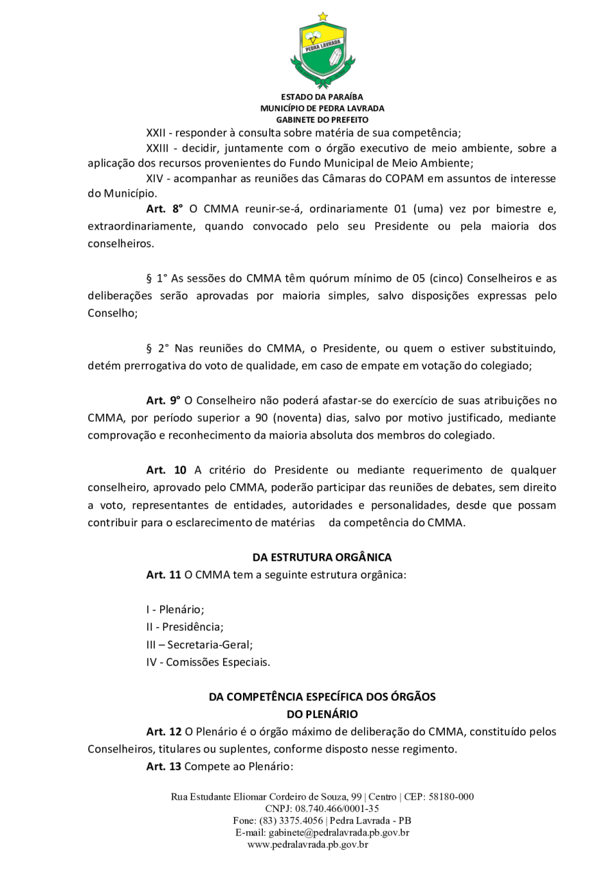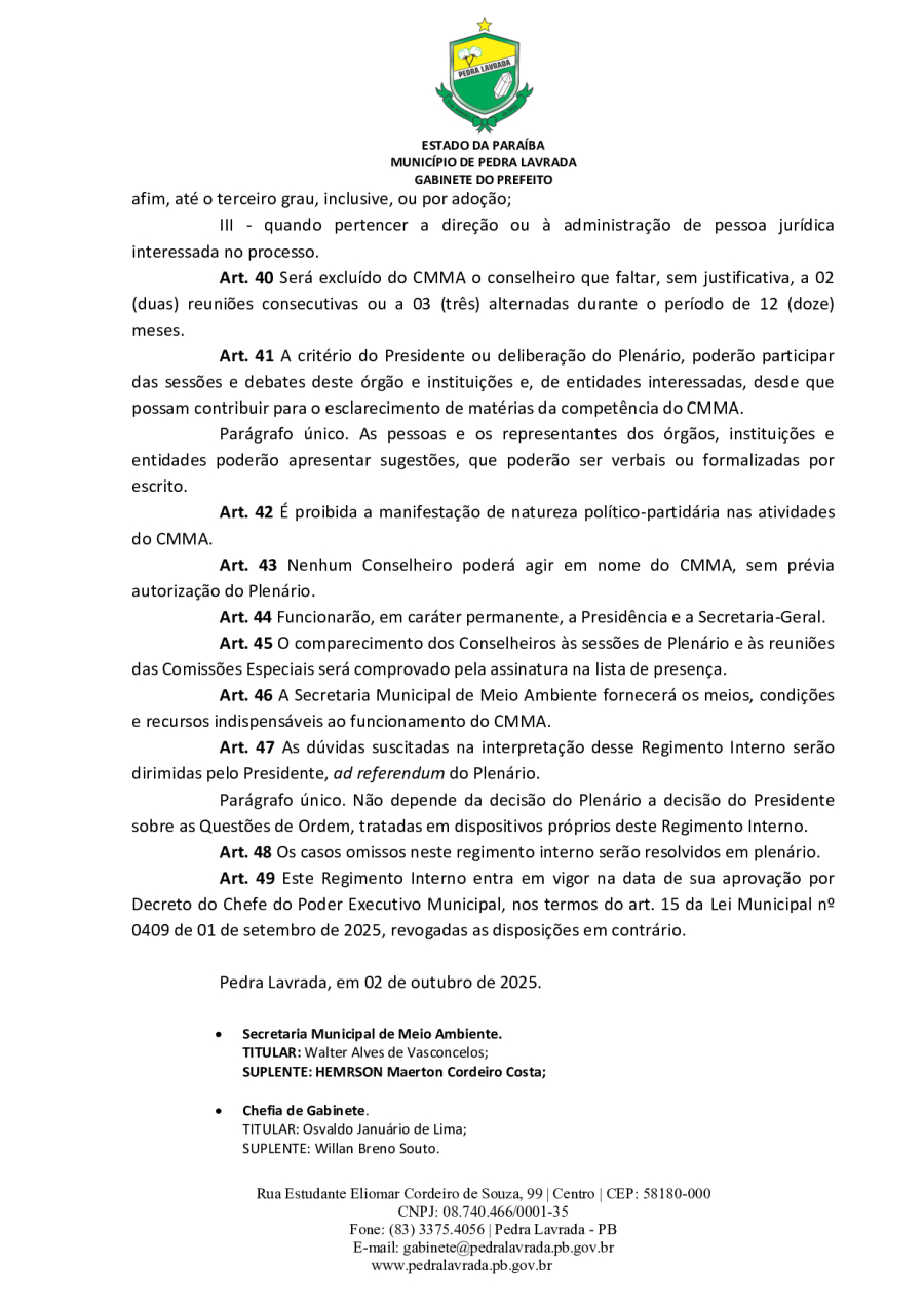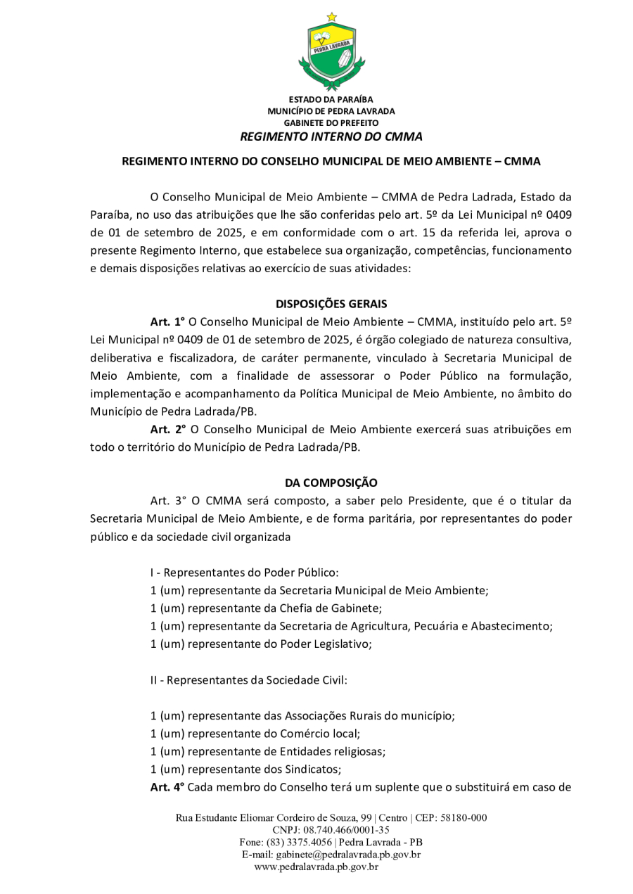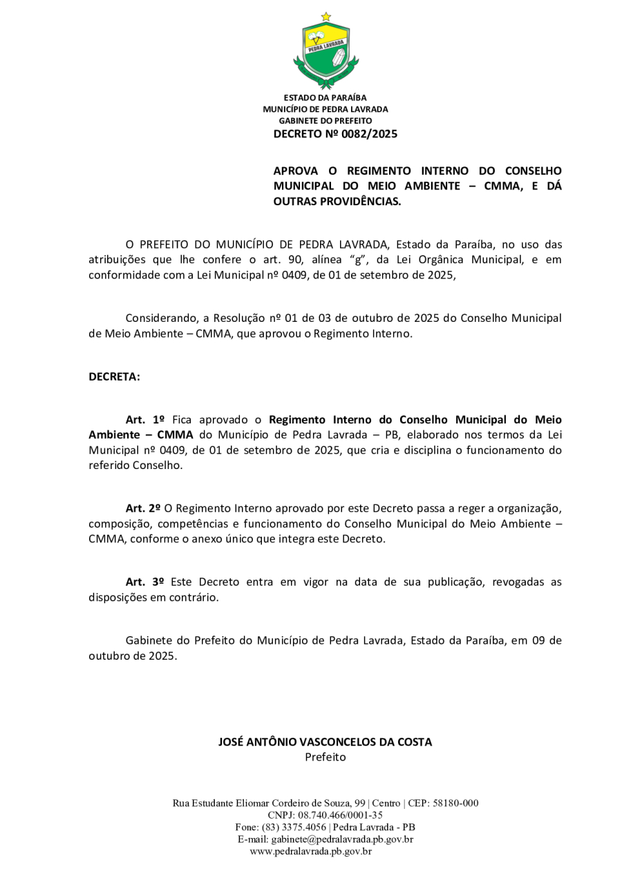 DECRETO N° 0082/2025 – APROVA O REGIMENTO INTERNO DO CONSELHO MUNICIPAL DO MEIO AMBIENTE – CMMA