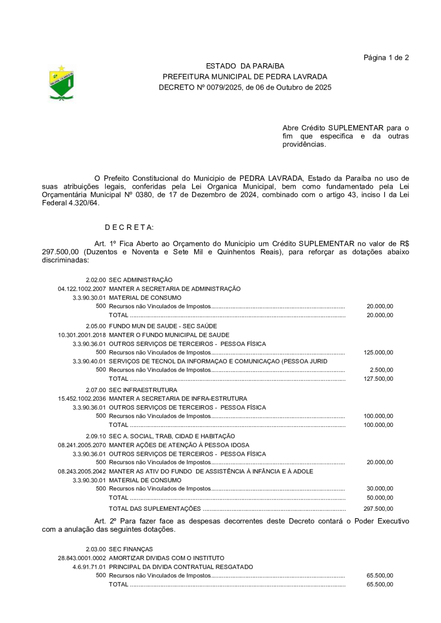 DECRETO N° 0079/2025 – ABRE CRÉDITO SUPLEMENTAR PARA O FIM QUE ESPECIFICA