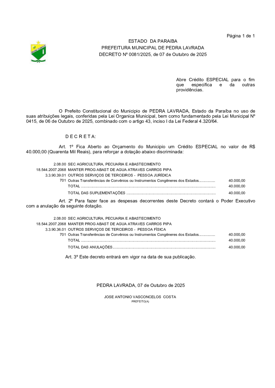 DECRETO N° 0081/2025 – ABRE CRÉDITO ESPECIAL PARA O FIM QUE ESPECIFICA