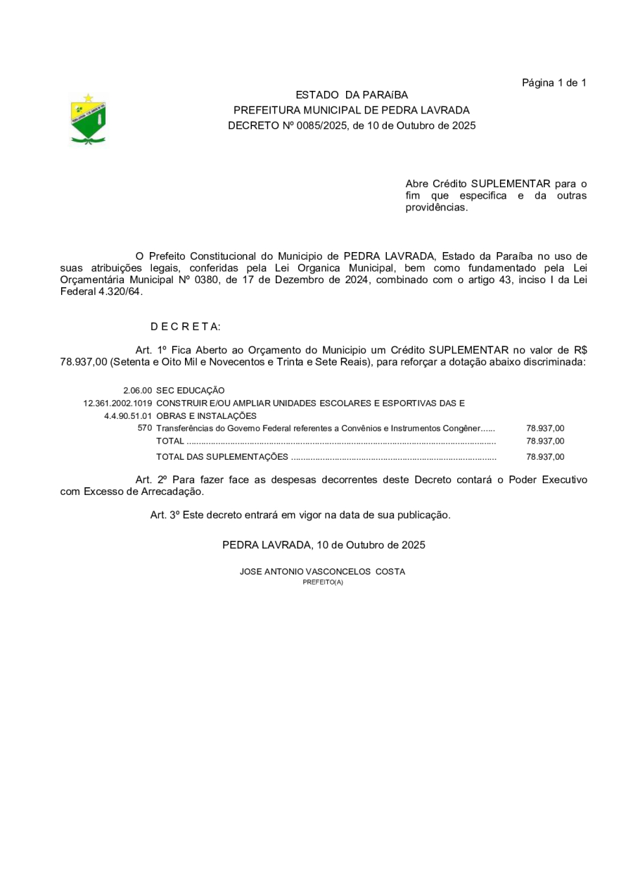 DECRETO N° 0085/2025 – ABRE CRÉDITO SUPLEMENTAR PARA O FIM QUE ESPECIFICA