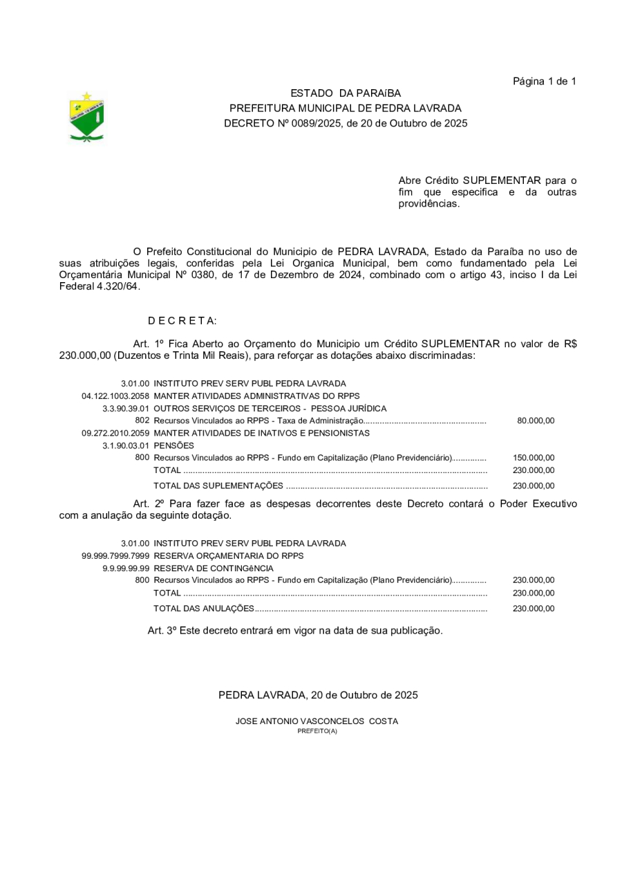 • DECRETO N° 0089/2025 – ABRE CRÉDITO SUPLEMENTAR PARA O FIM QUE ESPECIFICA