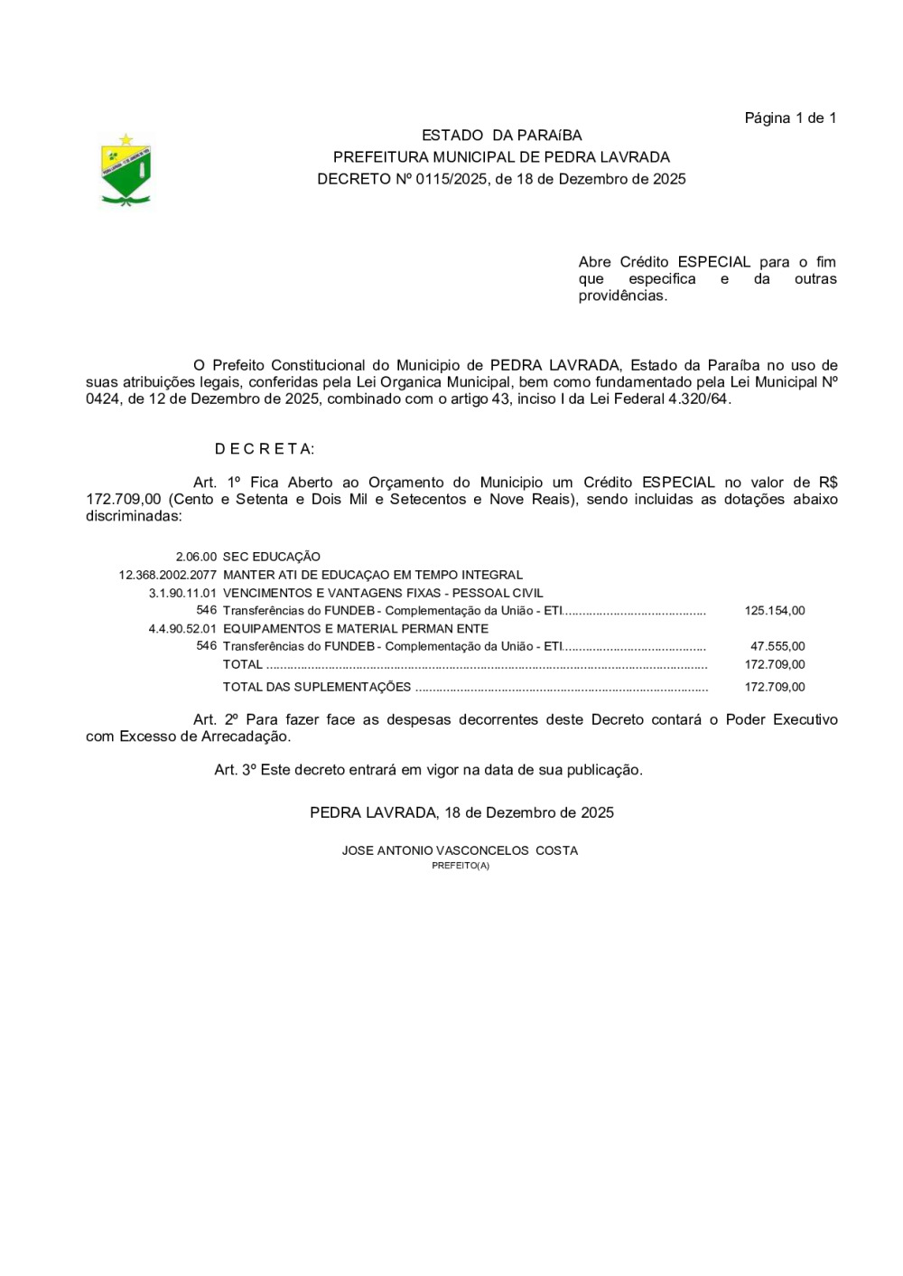 DECRETO N° 0115/2025 – ABRE CRÉDITO ESPECIAL PARA O FIM QUE ESPECIFICA