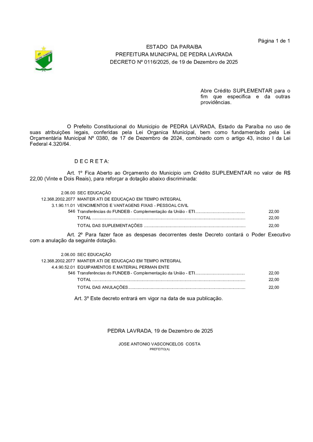 DECRETO N° 0116/2025 – ABRE CRÉDITO SUPLEMENTAR PARA O FIM QUE ESPECIFICA