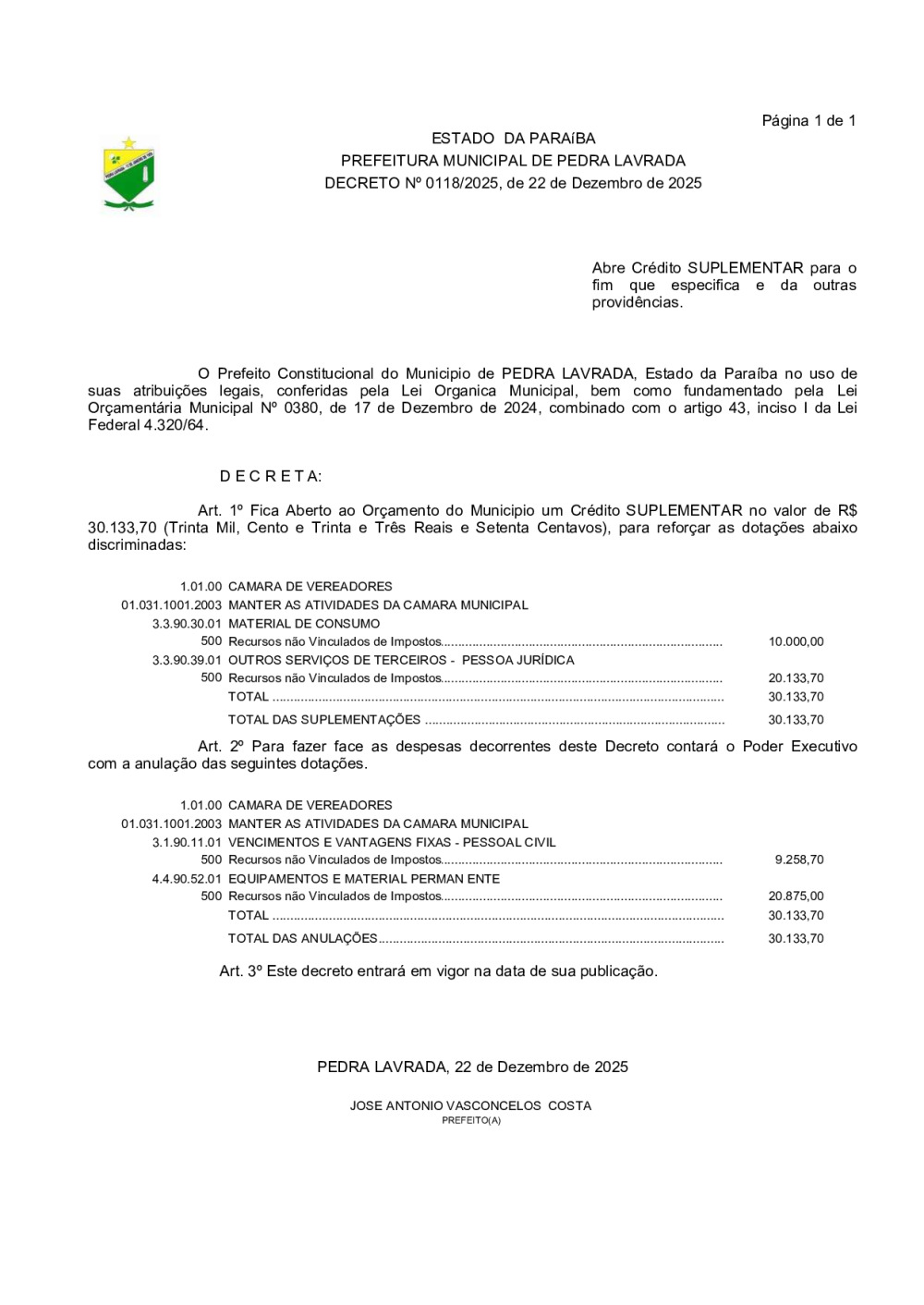 DECRETO N° 0118/2025 – ABRE CRÉDITO SUPLEMENTAR PARA O FIM QUE ESPECIFICA