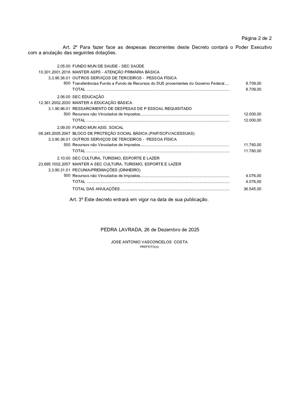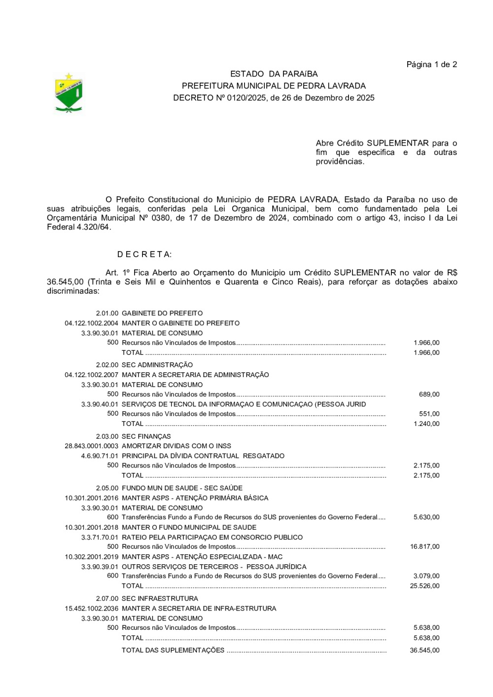 DECRETO N° 0120/2025 – ABRE CRÉDITO SUPLEMENTAR PARA O FIM QUE ESPECIFICA