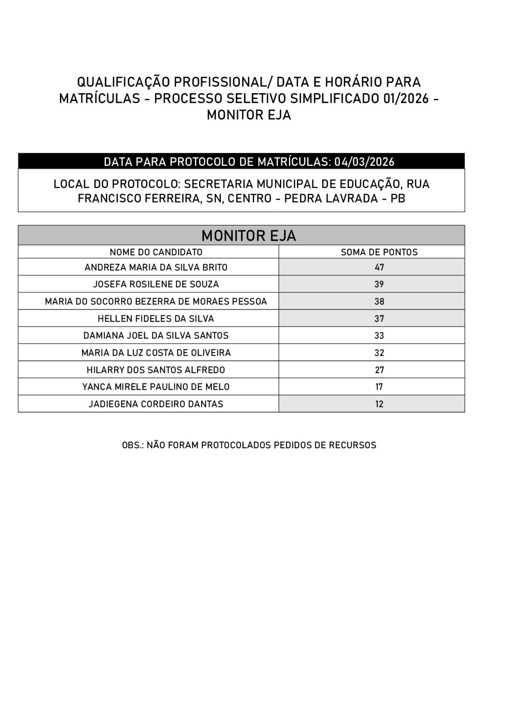 QUALIFICAÇÃO PROFISSIONAL/ DATA E HORÁRIO PARA MATRÍCULAS – PROCESSO SELETIVO SIMPLIFICADO 0001/2026 – MONITOR EJA