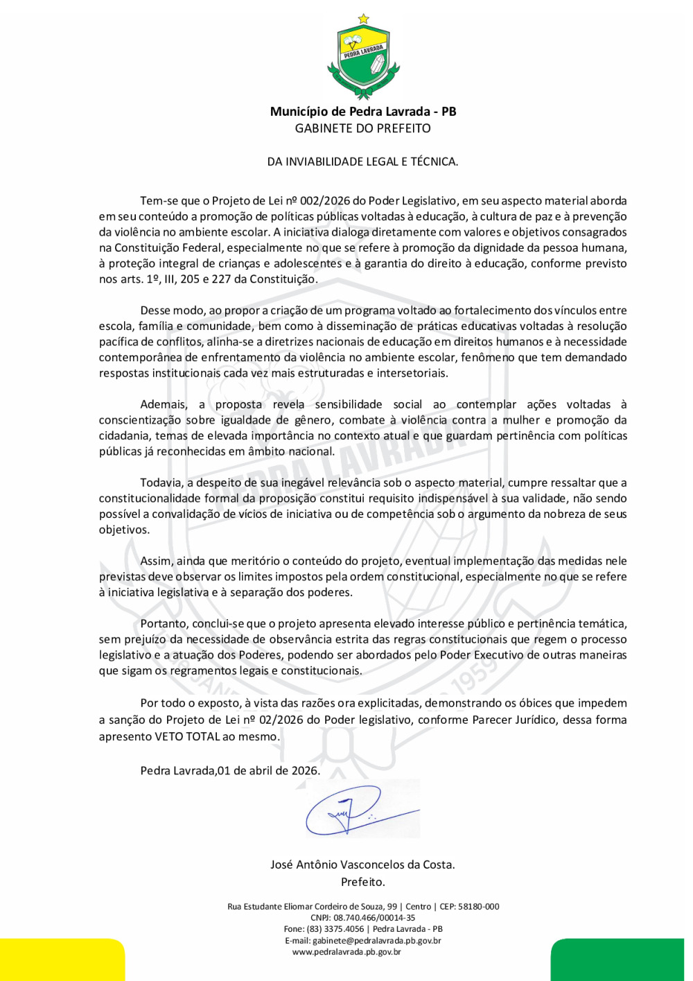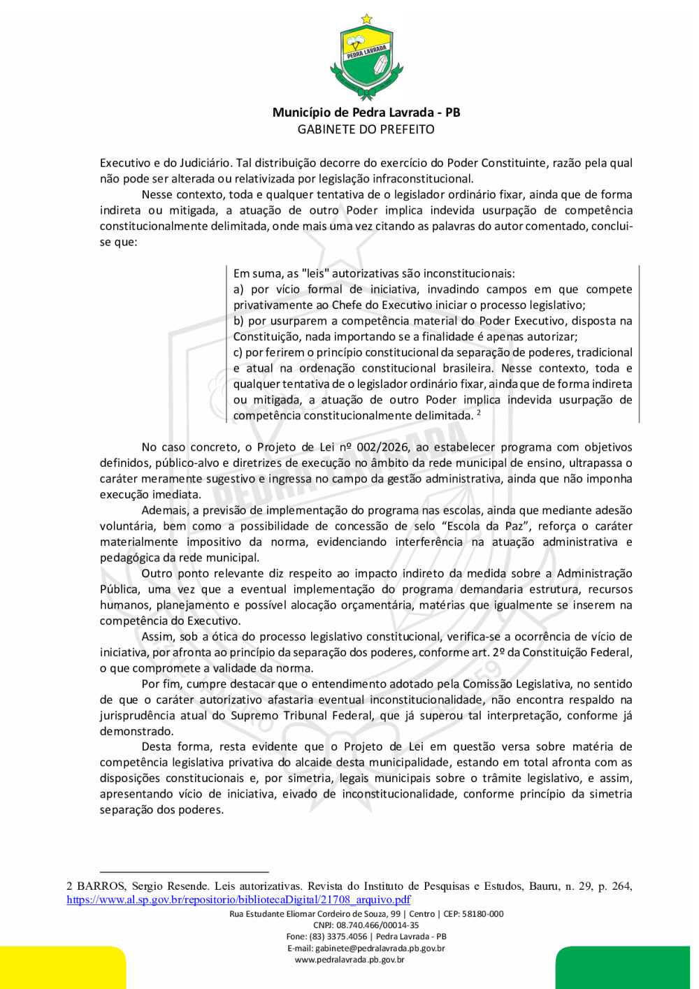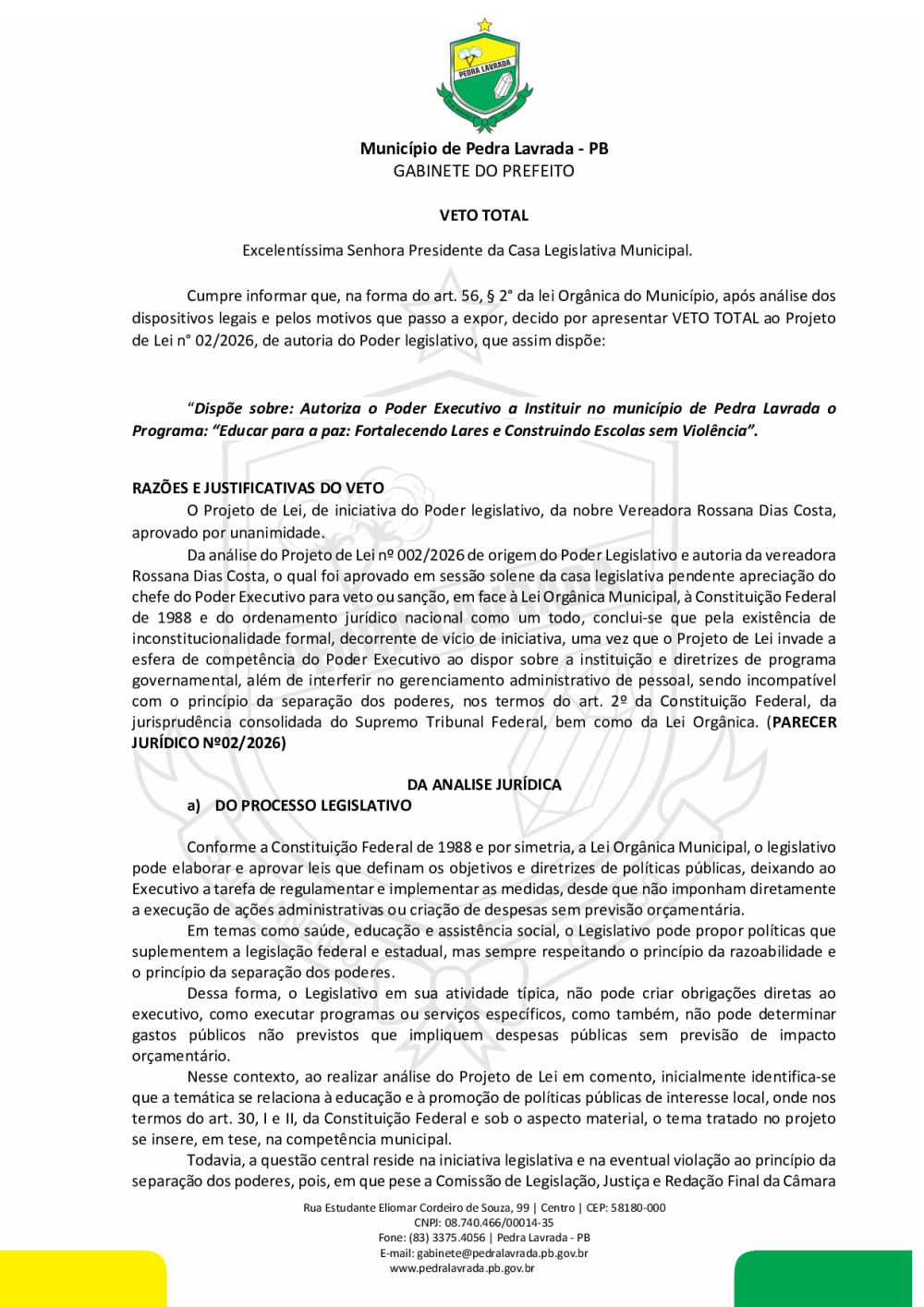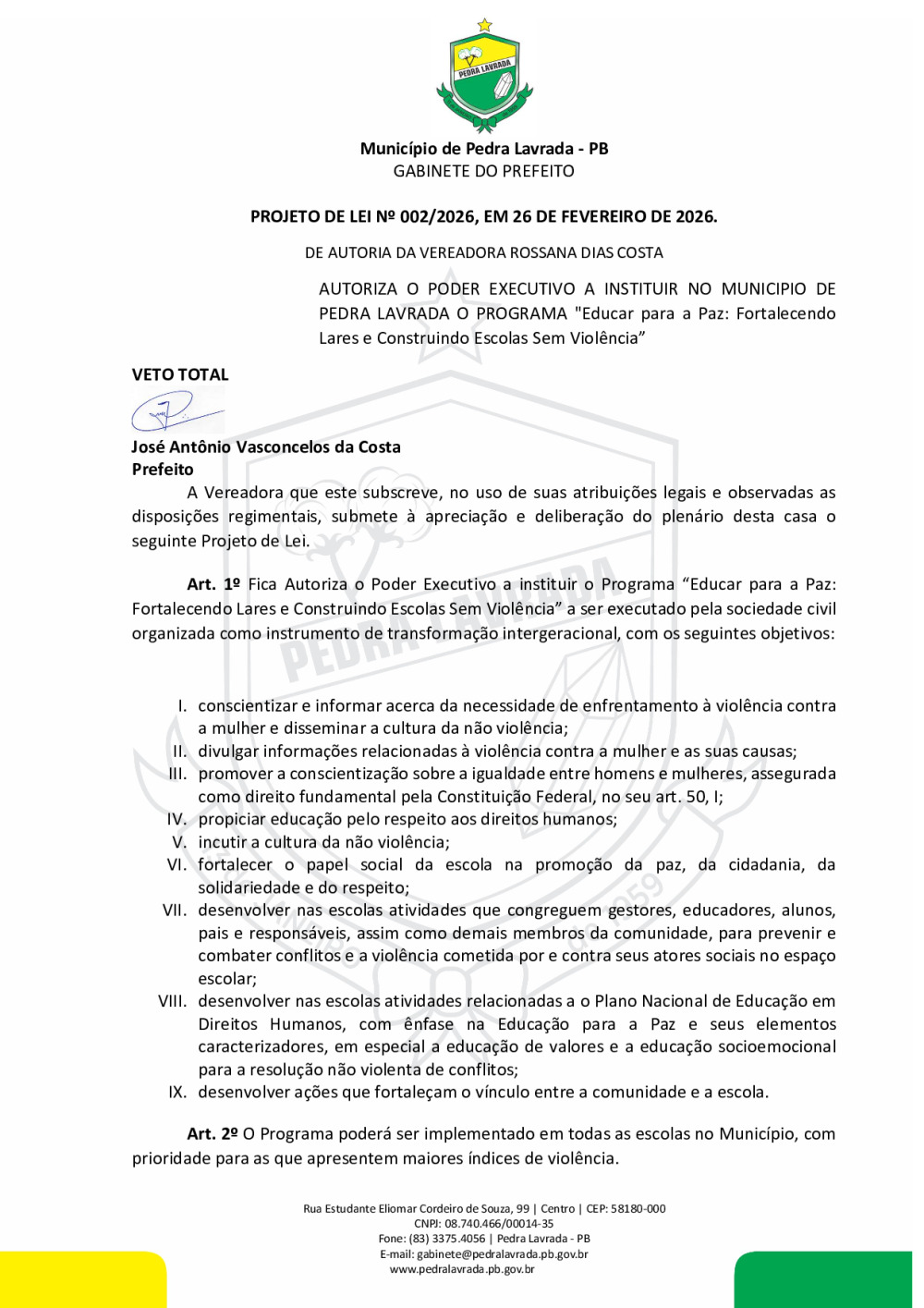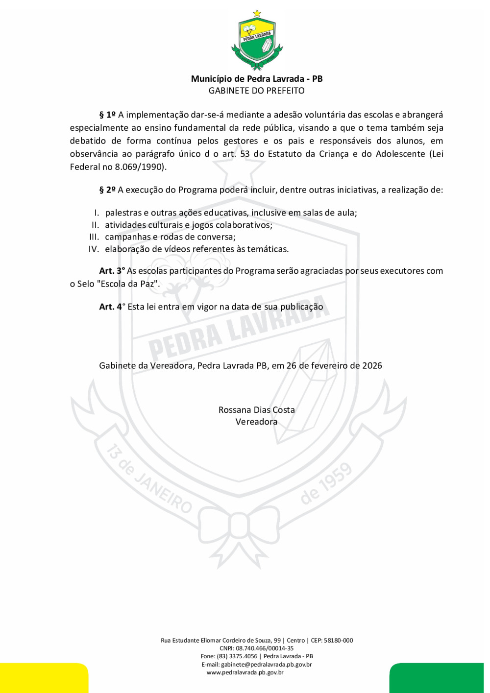 PROJETO DE LEI Nº 0002/2026 – DE AUTORIA DA VEREADORA ROSSANA DIAS COSTA – AUTORIZA O PODER EXECUTIVO A INSTITUIR NO MUNICIPIO DE PEDRA LAVRADA O PROGRAMA "EDUCAR PARA A PAZ: FORTALECENDO LARES E CONSTRUINDO ESCOLAS SEM VIOLÊNCIA