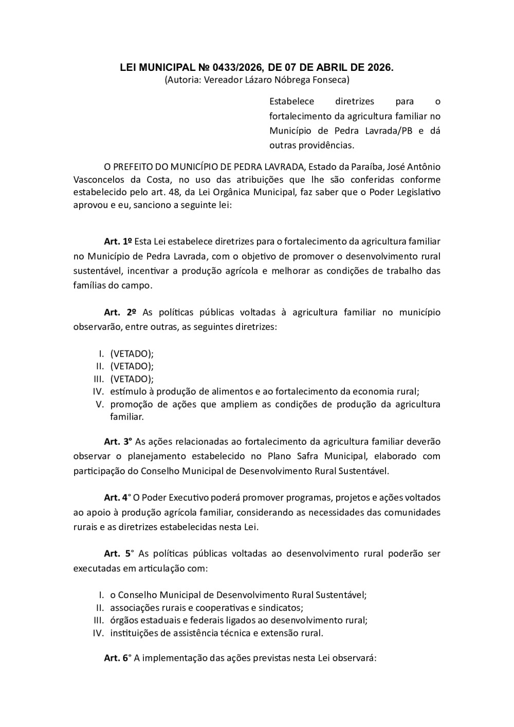 LEI Nº 0433/2026 – ESTABELECE DIRETRIZES PARA O FORTALECIMENTO DA AGRICULTURA FAMILIAR NO MUNICÍPIO