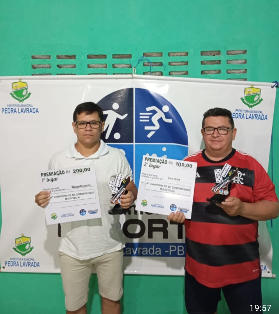 A Prefeitura de Pedra Lavrada, por meio da Secretaria de Esporte, realizou com sucesso mais uma edição do Campeonato Municipal de Dominó – 2025, na categoria individual masculino. A competição reuniu jogadores locais em uma disputa marcada pelo equilíbrio e pelo clima de confraternização.