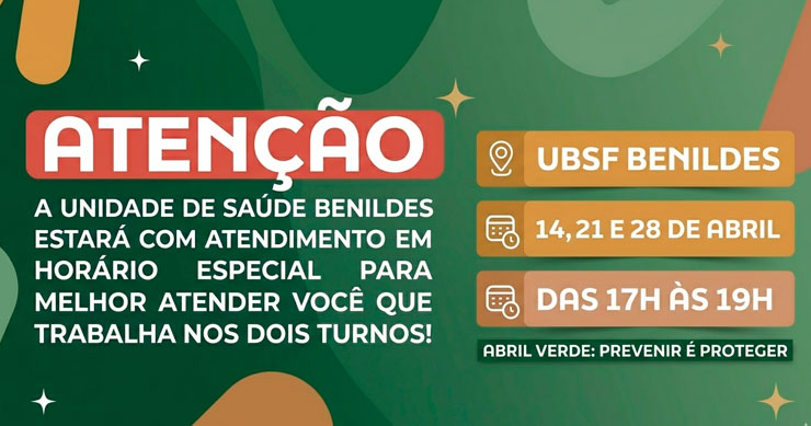 A Prefeitura de Pedra Lavrada, por meio da Secretaria Municipal de Saúde, realizará uma programação especial de atendimentos na Unidade Básica de Saúde da Família (UBSF) Benildes Fernandes, em alusão ao Abril Verde, campanha voltada à conscientização sobre a segurança e saúde do trabalhador.
