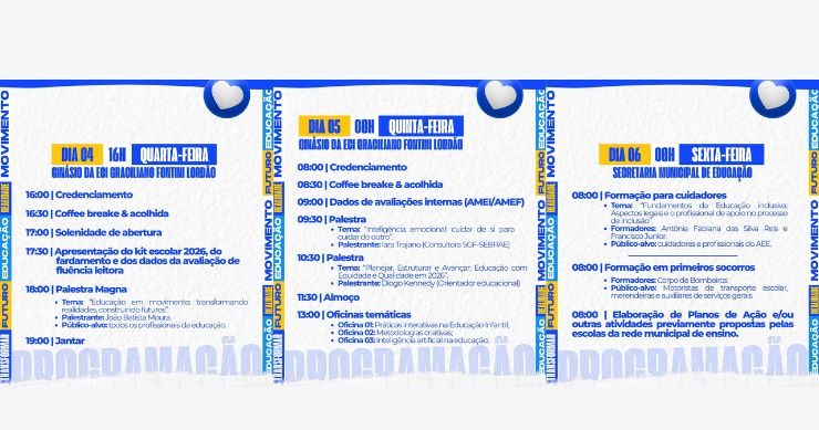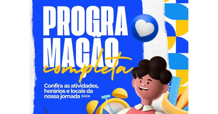 A abertura oficial acontece na quarta-feira (4), a partir das 16h, com credenciamento, acolhida, apresentação do kit escolar 2026, do fardamento e dos dados da avaliação de fluência leitora, além da palestra magna ministrada pelo pedagogo João Batista de Moura, que abordará o tema central da jornada.